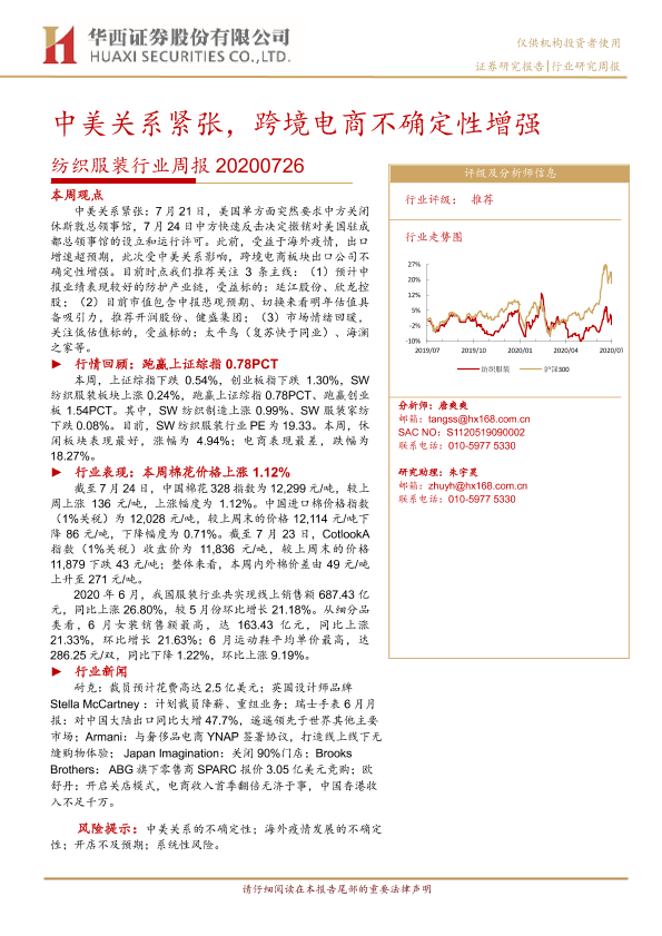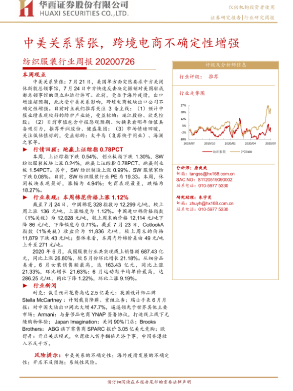 【华西证券】【20200726】20200726-华西证券-纺织服装行业周报:中美关系紧张,跨境电商不确定性增强-18页