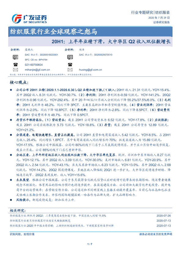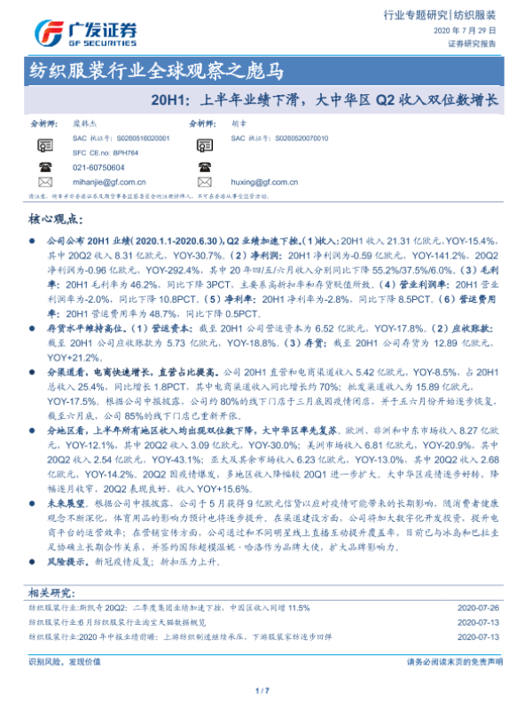 【广发证券】【20200729】纺织服装行业全球观察之彪马:20H1:上半年业绩下滑,大中华区Q2收入双位数增长-7页