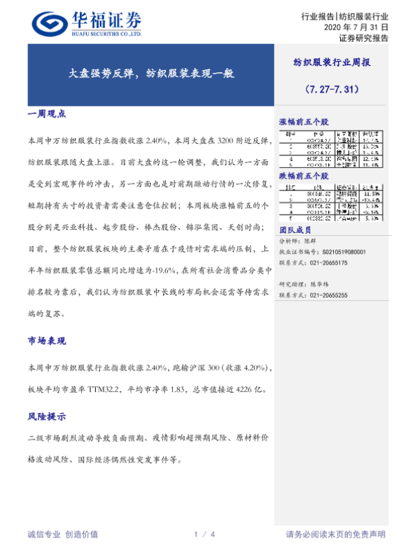 【华福证券】【20200731】20200731-华福证券-纺织服装行业周报:大盘强势反弹,纺织服装表现一般-4页