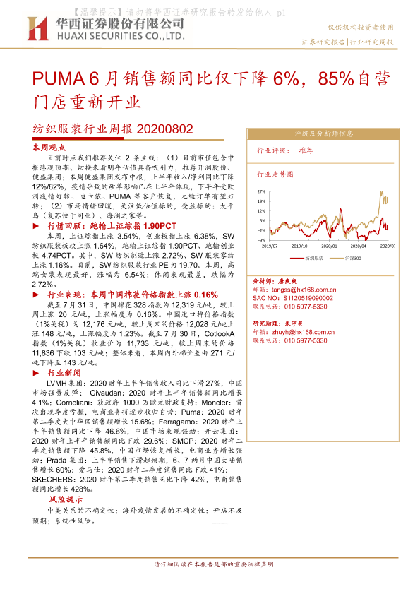 【华西证券】【20200802】20200802-华西证券-纺织服装行业周报:PUMA6月销售额同比仅下降6%,85%自营门店重新开业-21页