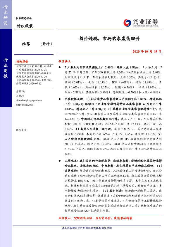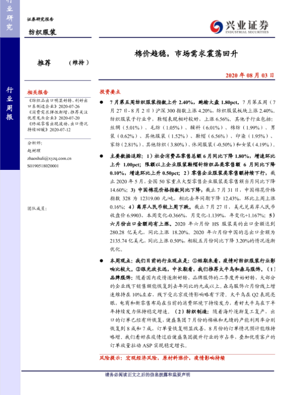 【兴业证券】【20200803】20200803-兴业证券-纺织服装行业周报:棉价趋稳,市场需求震荡回升-11页