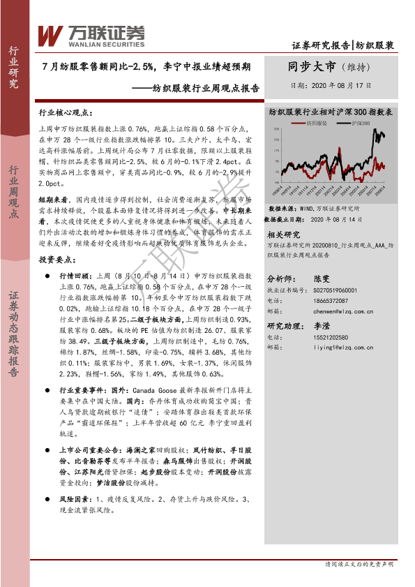 【万联证券】【20200817】20200817-万联证券-纺织服装行业周观点报告:7月纺服零售额同比-2.5%,李宁中报业绩超预期-9页