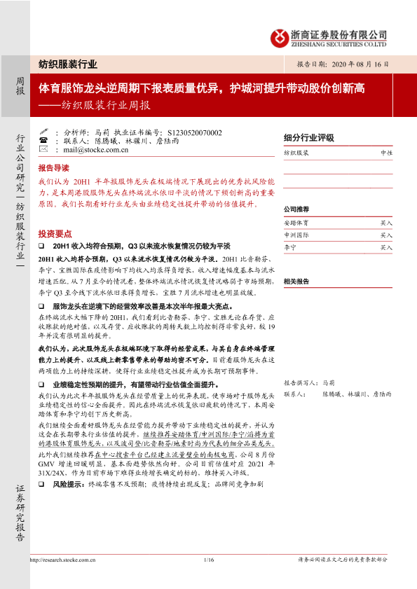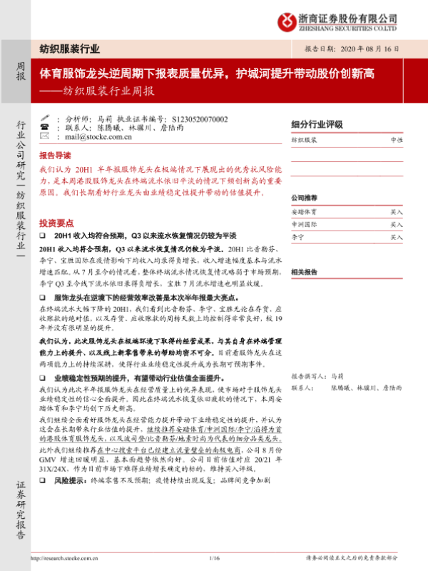 【浙商证券】【20200816】20200816-浙商证券-纺织服装行业周报:体育服饰龙头逆周期下报表质量优异,护城河提升带动股价创新高-16页