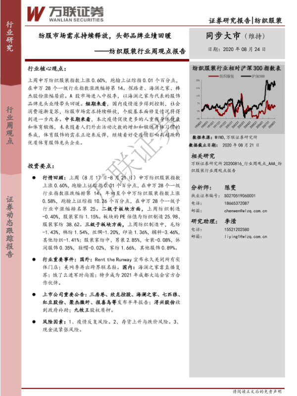 【万联证券】【20200824】20200824-万联证券-纺织服装行业周观点报告:纺服市场需求持续释放,头部品牌业绩回暖-9页