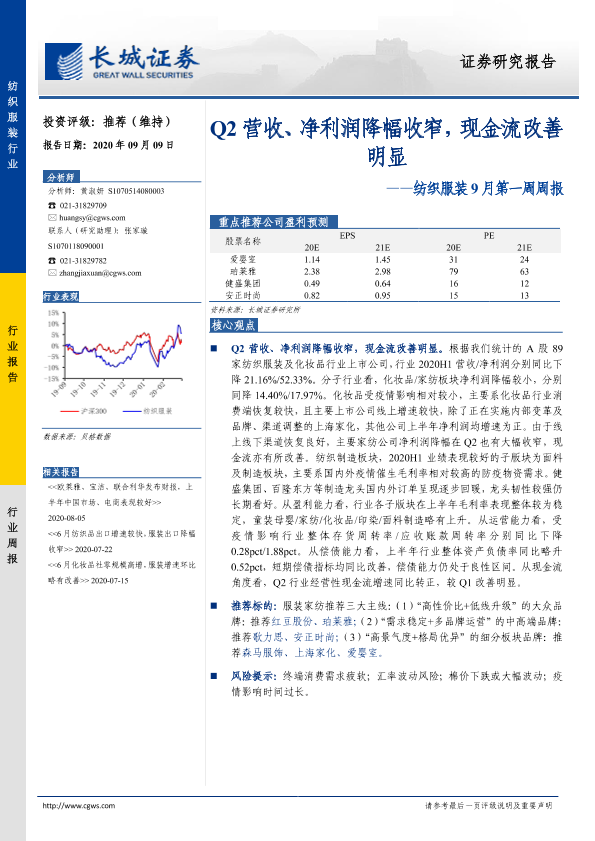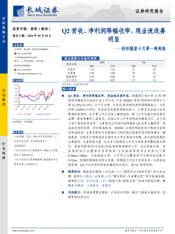 【长城证券】【20200909】纺织服装9月第一周周报:Q2营收、净利润降幅收窄,现金流改善明显-21页