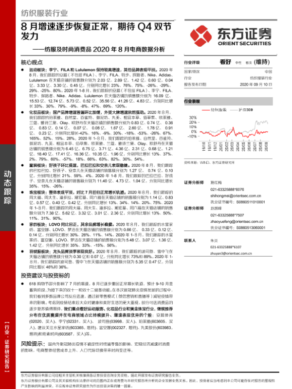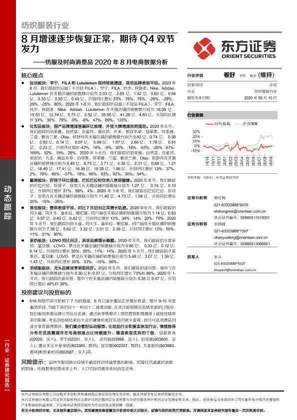 【东方证券】【20200910】纺服及时尚消费品2020年8月电商数据分析:8月增速逐步恢复正常,期待Q4双节发力-15页