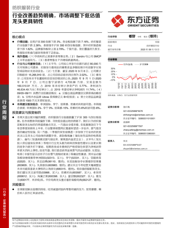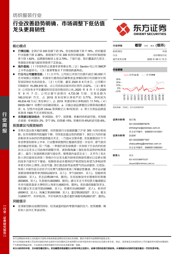 【东方证券】【20200913】20200913-东方证券-纺织服装行业:行业改善趋势明确,市场调整下低估值龙头更具韧性-12页