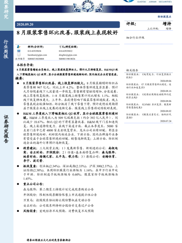 【国泰君安证券】【20200920】20200920-国泰君安-纺织服装行业周报:8月服装零售环比改善,服装线上表现较好-21页