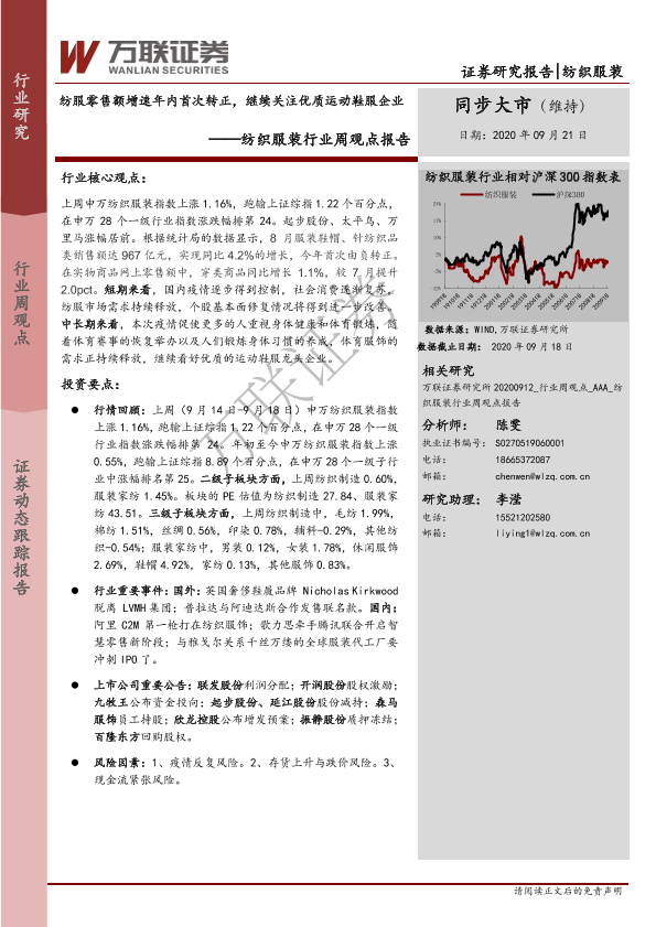 【万联证券】【20200921】20200921-万联证券-纺织服装行业周观点报告:纺服零售额增速年内首次转正,继续关注优质运动鞋服企业-9页
