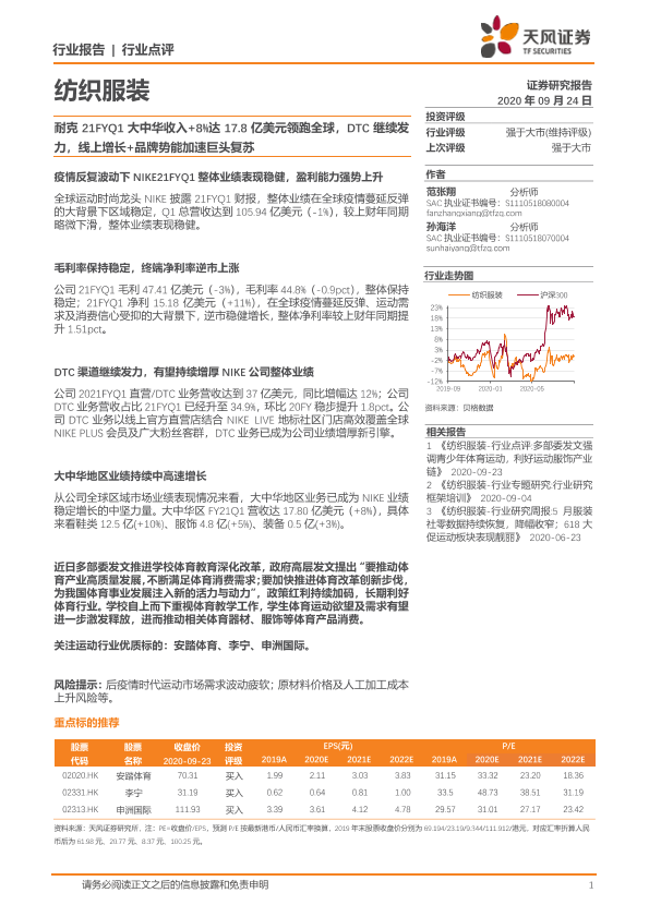 【天风证券】【20200924】纺织服装行业点评:耐克21FYQ1大中华收入+8%达17.8亿美元领跑全球,DTC继续发力,线上增长+品牌势能加速巨头复苏-2页