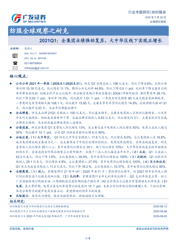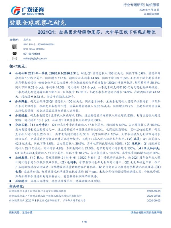 【广发证券】【20200928】纺服全球观察之耐克:2021Q1:全集团业绩强劲复苏,大中华区线下实现正增长-6页