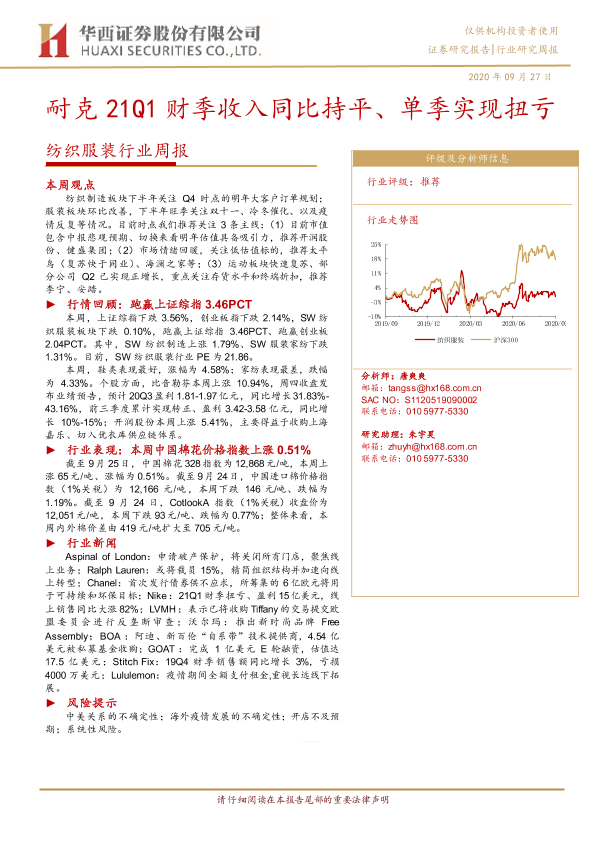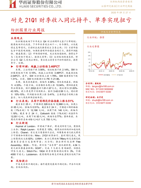 【华西证券】【20200927】20200927-华西证券-纺织服装行业周报:耐克21Q1财季收入同比持平、单季实现扭亏-16页