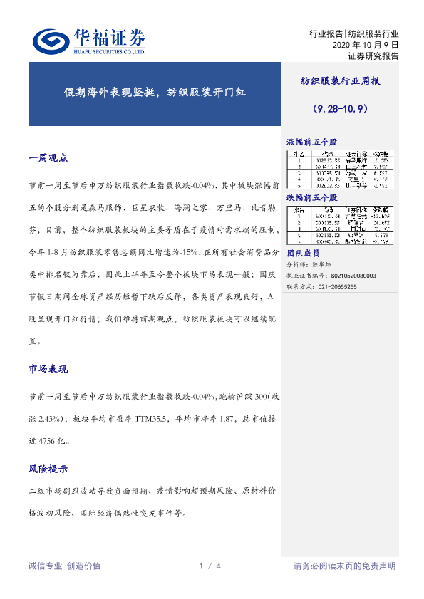 【华福证券】【20201009】20201009-华福证券-纺织服装行业周报:假期海外表现坚挺,纺织服装开门红-4页