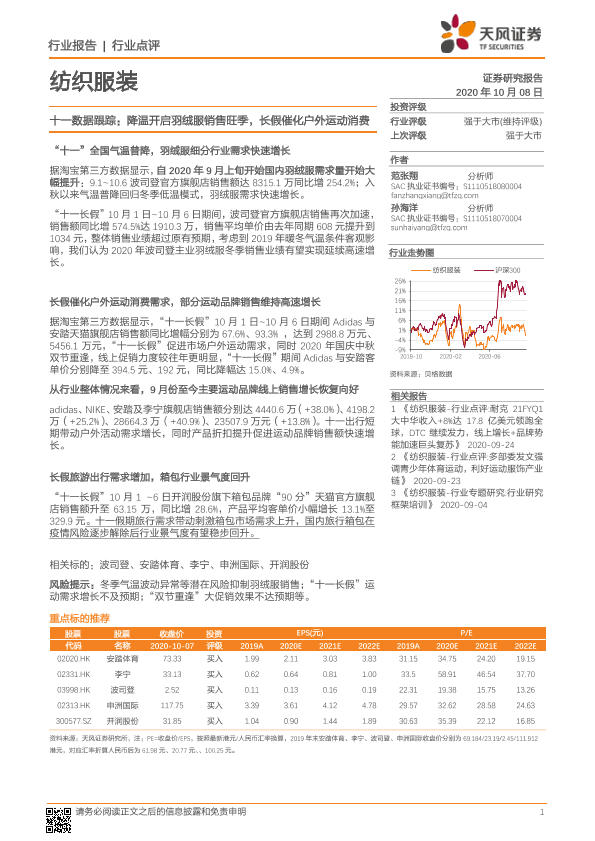 【天风证券】【20201008】纺织服装十一数据跟踪:降温开启羽绒服销售旺季,长假催化户外运动消费-2页