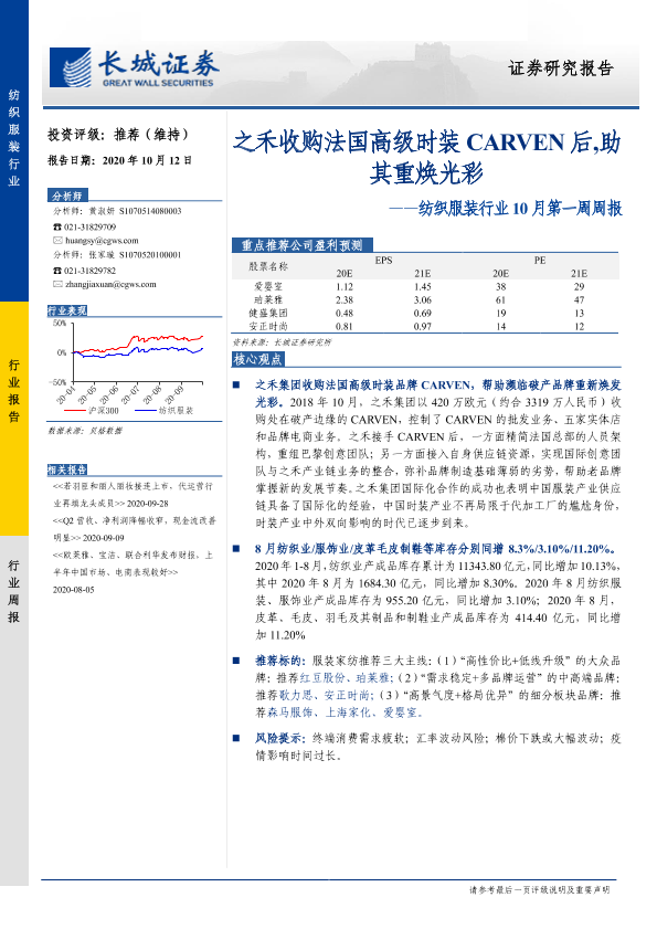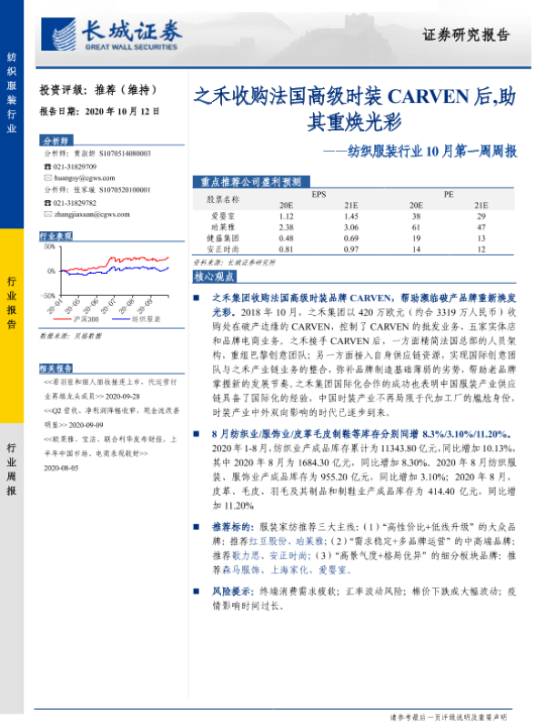 【长城证券】【20201012】20201012-长城证券-纺织服装行业10月第一周周报:之禾收购法国高级时装CARVEN后,助其重焕光彩-22页