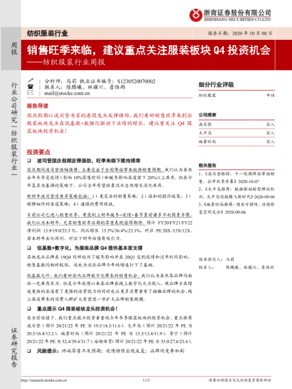【浙商证券】【20201008】20201008-浙商证券-纺织服装行业周报:销售旺季来临,建议重点关注服装板块Q4投资机会-13页