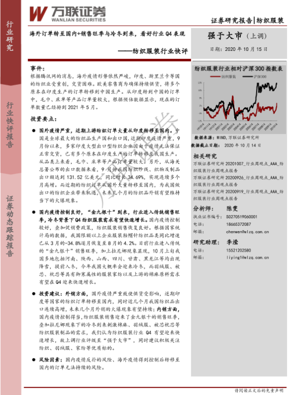 【万联证券】【20201015】纺织服装行业快评:海外订单转至国内+销售旺季与冷冬到来,看好行业Q4表现-2页