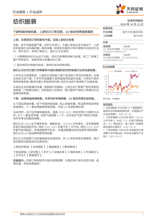 【天风证券】【20201015】纺织服装行业点评:下游终端持续恢复,上游纺企订单回流,Q4板块有望强势复苏-3页
