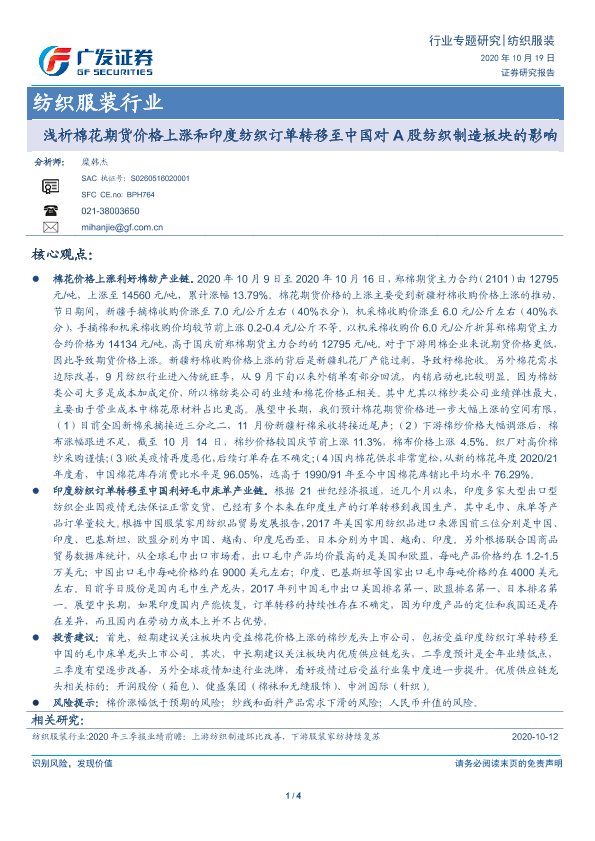 【广发证券】【20201019】浅析棉花期货价格上涨和印度纺织订单转移至中国对A股纺织制造板块的影响-4页