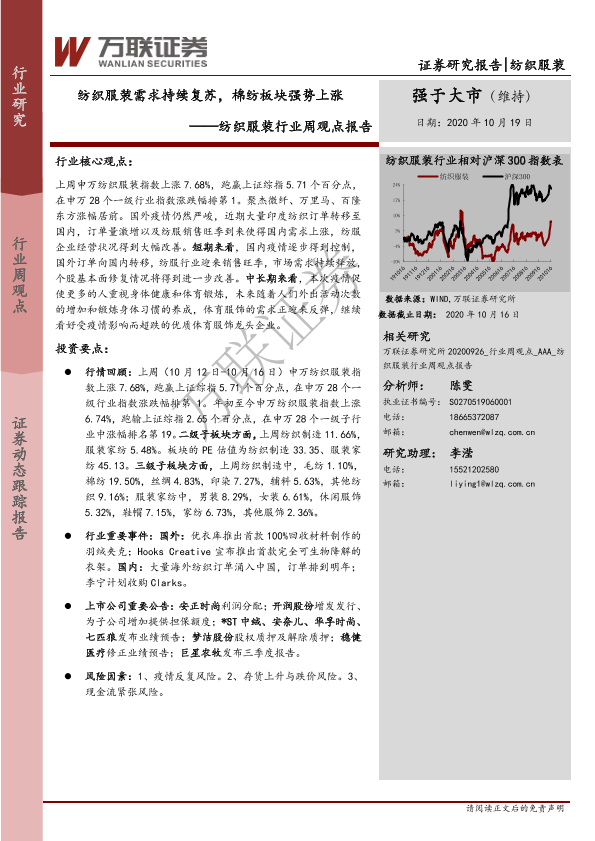 【万联证券】【20201019】20201019-万联证券-纺织服装行业周观点报告:纺织服装需求持续复苏,棉纺板块强势上涨-9页