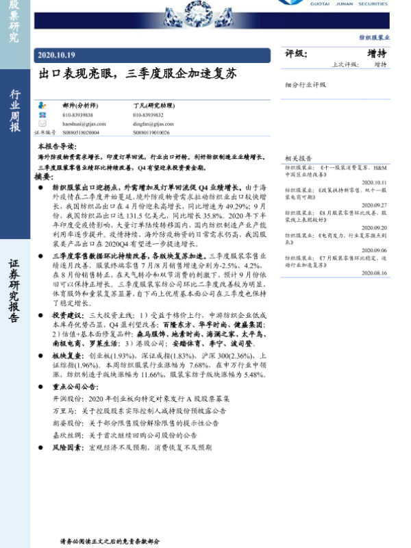 【国泰君安证券】【20201019】20201019-国泰君安-纺织服装业行业周报:出口表现亮眼,三季度服企加速复苏-19页