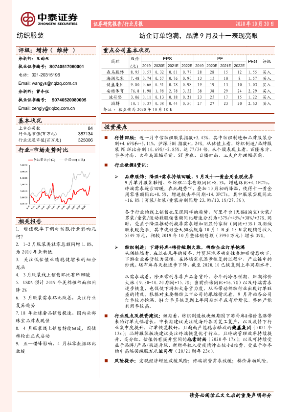 【中泰证券】【20201020】20201020-中泰证券-纺织服装行业月报:纺企订单饱满,品牌9月及十一表现亮眼-15页