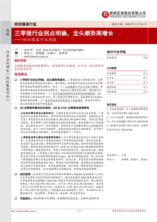 【浙商证券】【20201101】20201101-浙商证券-纺织服装行业周报:三季报行业拐点明确,龙头顺势高增长-15页