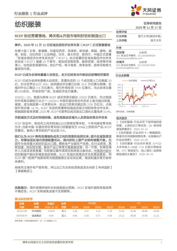 【天风证券】【20201117】纺织服装行业报告:RCEP协定签署落地,降关税&开放市场利好纺织制造出口-2页