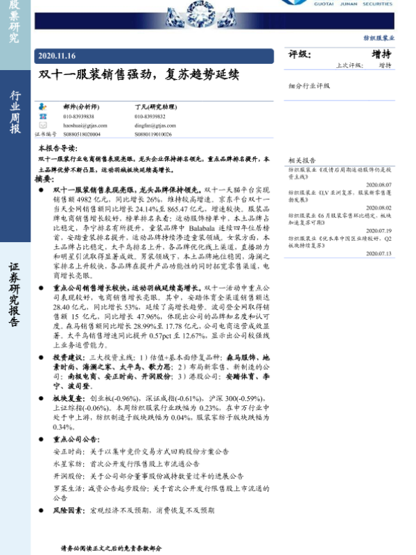 【国泰君安证券】【20201116】20201116-国泰君安-纺织服装行业周报:双十一服装销售强劲,复苏趋势延续-22页
