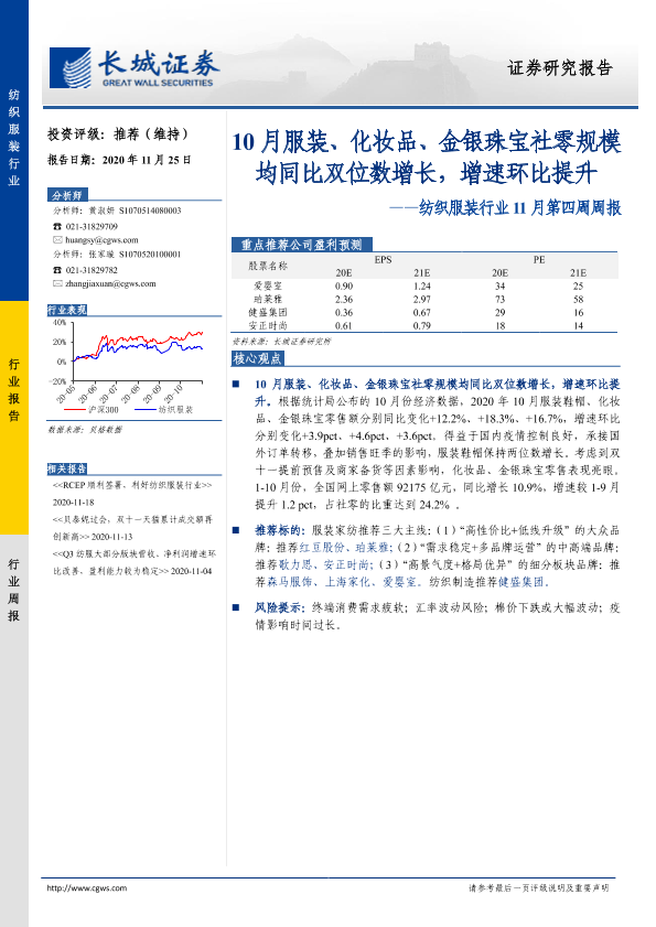 【长城证券】【20201125】纺织服装行业11月第四周周报:10月服装、化妆品、金银珠宝社零规模均同比双位数增长,增速环比提升-21页