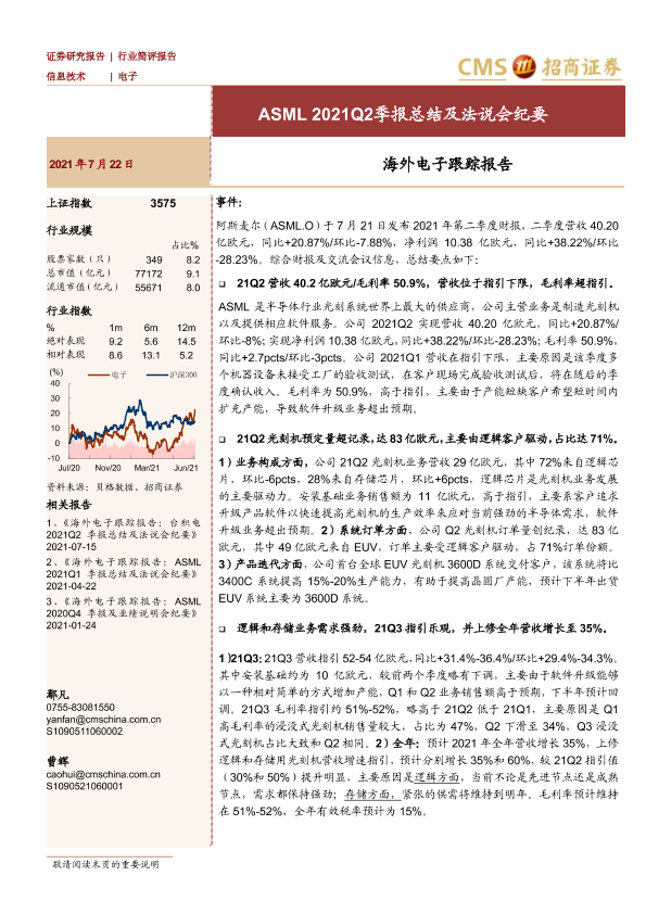 【海通证券】【20210723】海外电子行业跟踪报告:ASML_2021Q2季报总结及法说会纪要-13页