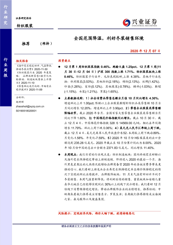 【兴业证券】【20201207】20201207-兴业证券-纺织服装行业周报:全国范围降温,利好冬装销售环境-11页
