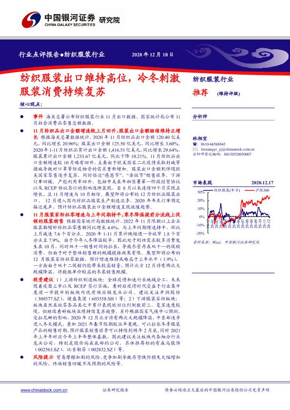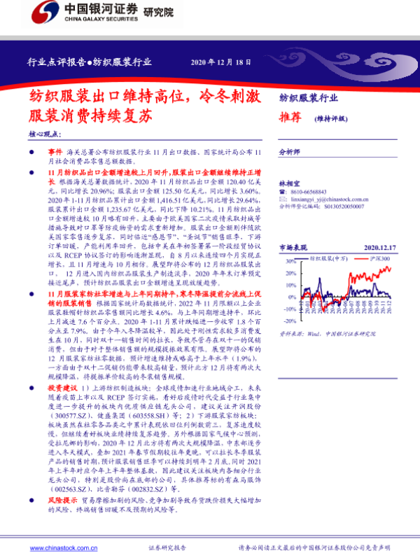 【银河证券】【20201218】纺织服装行业点评报告:纺织服装出口维持高位,冷冬刺激服装消费持续复苏-2页