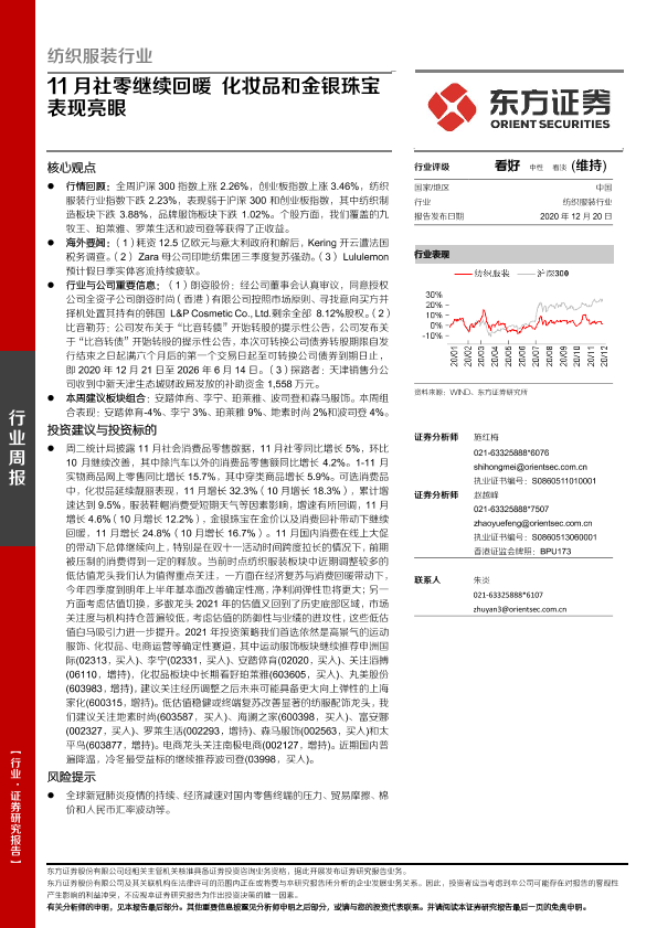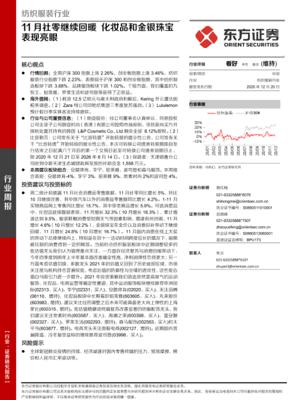 【东方证券】【20201220】纺织服装行业:11月社零继续回暖 化妆品和金银珠宝表现亮眼-9页