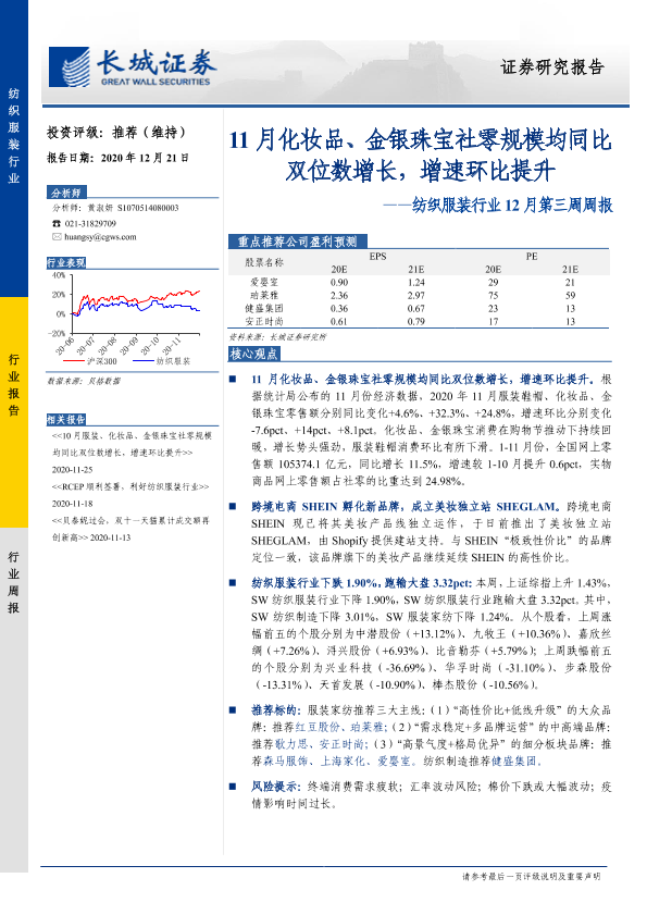 【长城证券】【20201221】20201221-长城证券-纺织服装行业12月第三周周报:11月化妆品、金银珠宝社零规模均同比双位数增长,增速环比提升-16页