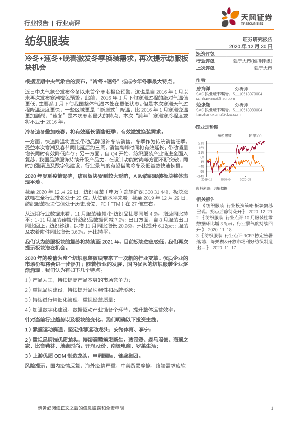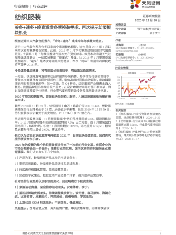 【天风证券】【20201230】纺织服装:冷冬+速冬+晚春激发冬季换装需求,再次提示纺服板块机会-2页
