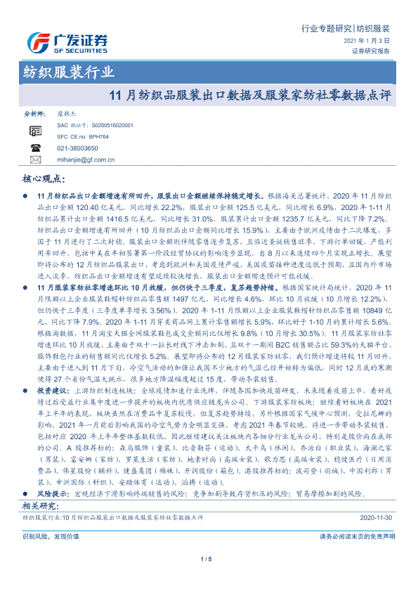 【广发证券】【20210103】11月纺织品服装出口数据及服装家纺社零数据点评-5页