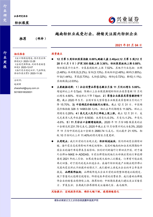 【兴业证券】【20210104】20210104-兴业证券-纺织服装行业周报:越南纺织业或受打击,持续关注国内纺织企业-10页