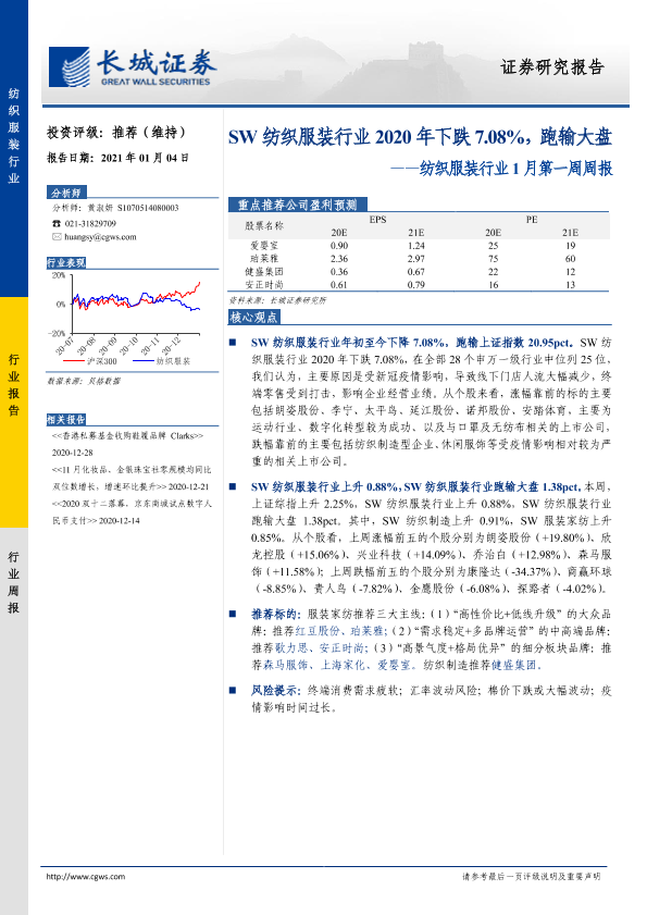 【长城证券】【20210104】SW纺织服装行业2020年下跌7.08%,跑输大盘-16页