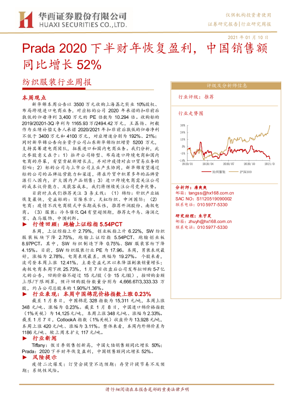 【华西证券】【20210110】20210110-华西证券-纺织服装行业周报:Prada2020下半财年恢复盈利,中国销售额同比增长52%-13页