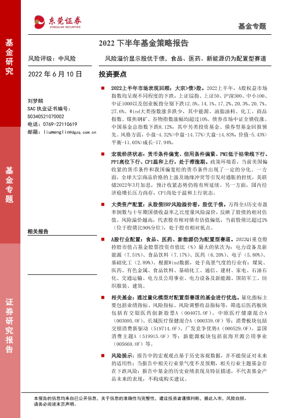 【东莞证券】【20220610】2022下半年基金策略报告:风险溢价显示股优于债,食品、医药、新能源仍为配置型赛道-15页