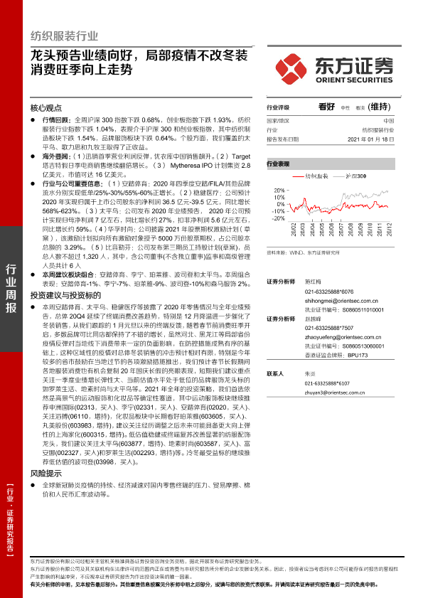 【东方证券】【20210118】纺织服装行业:龙头预告业绩向好,局部疫情不改冬装消费旺季向上走势-9页