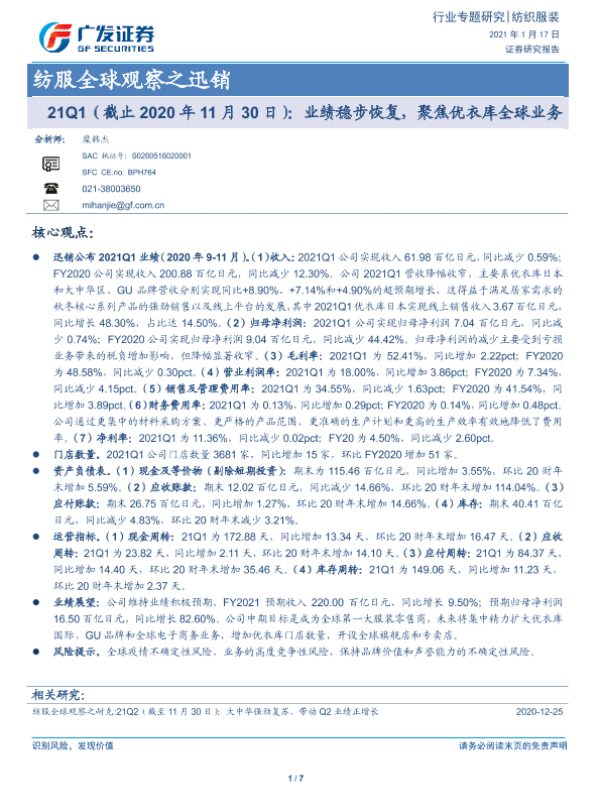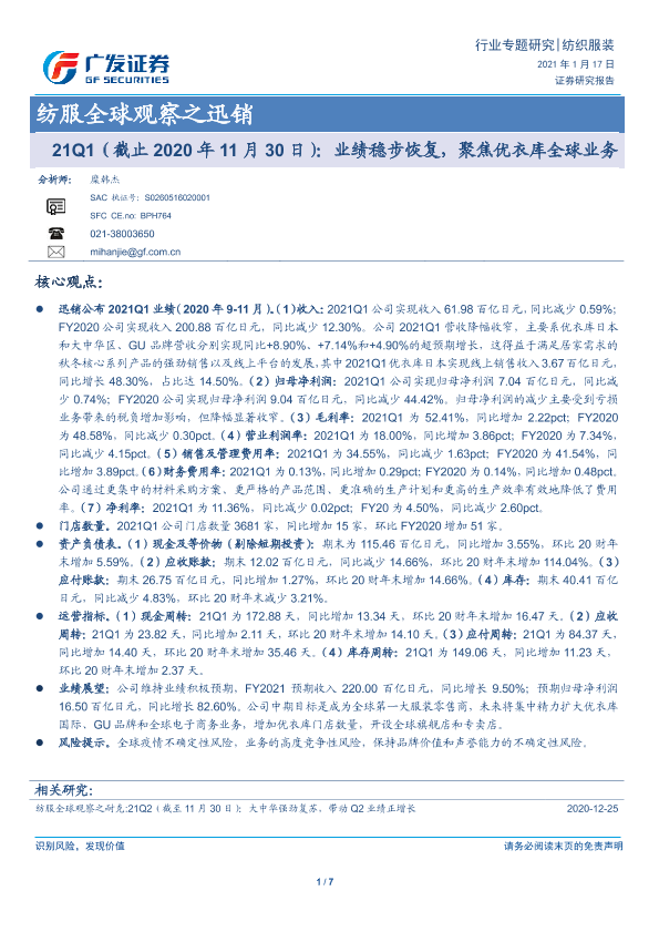 【广发证券】【20210117】纺服全球观察之迅销:21Q1(截止2020年11月30日):业绩稳步恢复,聚焦优衣库全球业务-7页