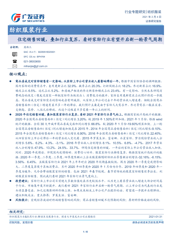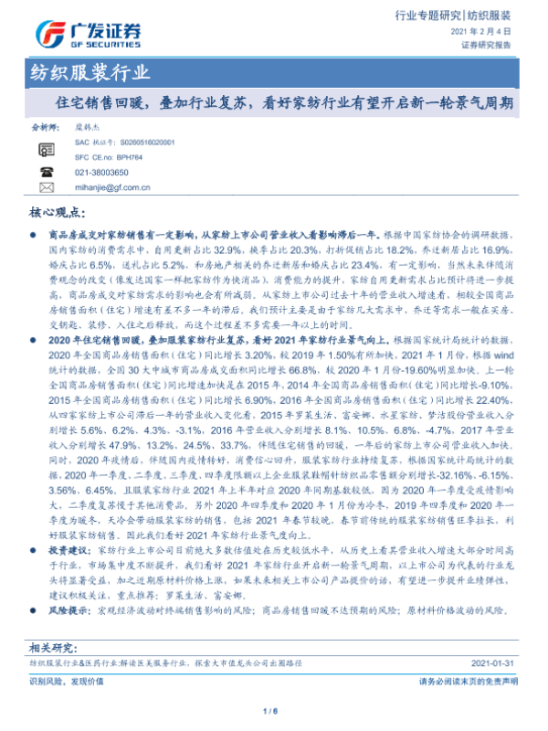 【广发证券】【20210204】纺织服装行业专题研究:住宅销售回暖,叠加行业复苏,看好家纺行业有望开启新一轮景气周期-6页