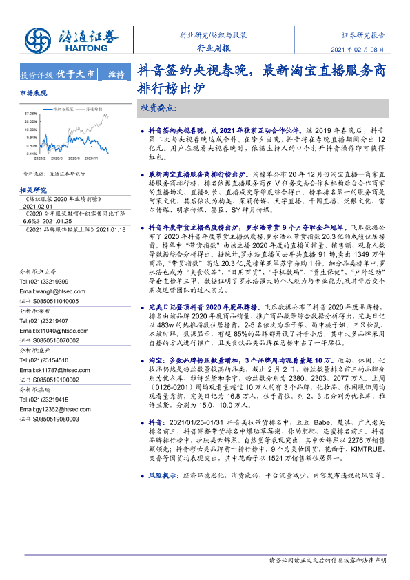 【海通证券】【20210208】20210208-海通证券-纺织与服装行业周报:抖音签约央视春晚,最新淘宝直播服务商排行榜出炉-10页