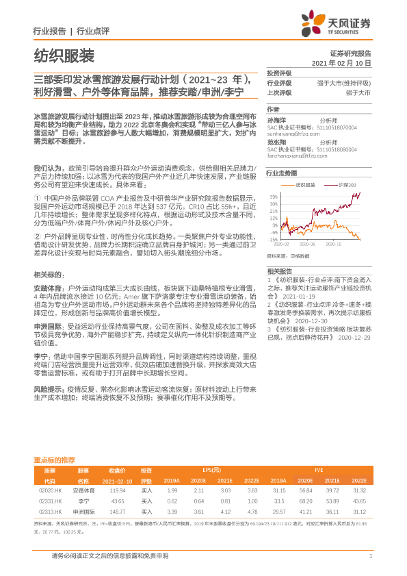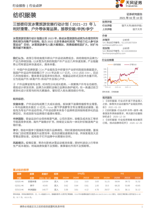 【天风证券】【20210210】纺织服装行业点评:三部委印发冰雪旅游发展行动计划(2021-23年),利好滑雪、户外等体育品牌,推荐安踏/申洲/李宁-2页