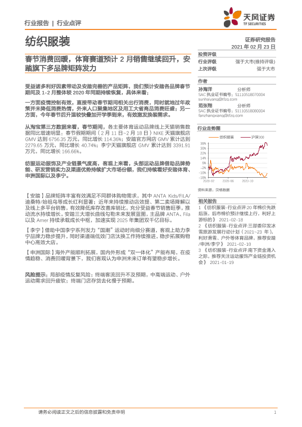 【天风证券】【20210223】纺织服装行业点评:春节消费回暖,体育赛道预计2月销售继续回升,安踏旗下多品牌矩阵发力-2页