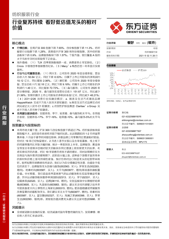 【东方证券】【20210228】20210228-东方证券-纺织服装行业周报:行业复苏持续 看好低估值龙头的相对价值-8页
