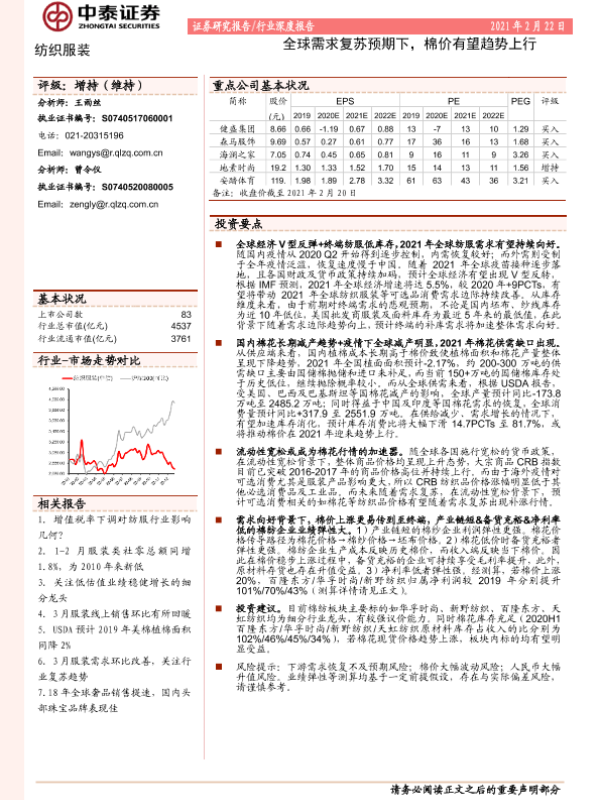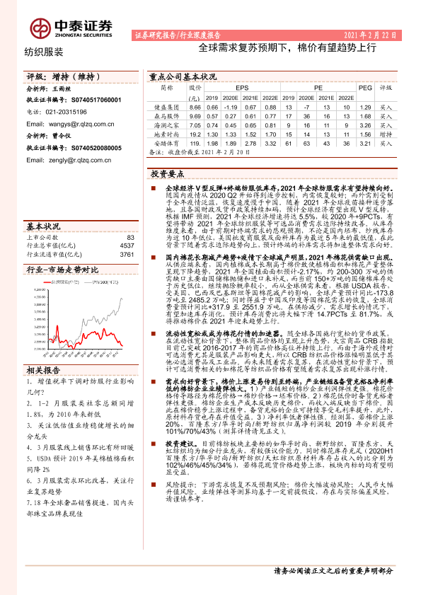【中泰证券】【20210222】纺织服装行业深度报告:全球需求复苏预期下,棉价有望趋势上行-18页
