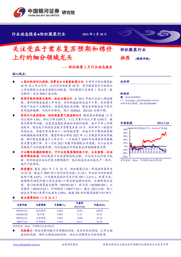 【银河证券】【20210228】20210228-中国银河-纺织服装2月行业动态报告:关注受益于需求复苏预期和棉价上行的细分领域龙头-27页